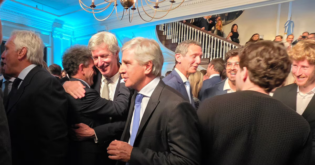 Minutos antes se vio a Luis “Toto” Caputo, muy requerido en los saludos, acompañado por Bettina y Alejandro Bulgheroni, de PAE. Luego mantuvo un diálogo extenso con otro financiero: Gabriel Martino, ex presidente de HSBC. El titular del Palacio de Hacienda llegó junto al presidente del Banco Central, Santiago Bausili, y sus secretarios Pablo Lavigne, José Luis Daza y Daniel González. Mario Lugones, ministro de Salud, tuvo menos demanda entre los asistentes, algo comprensible por el perfil del evento.