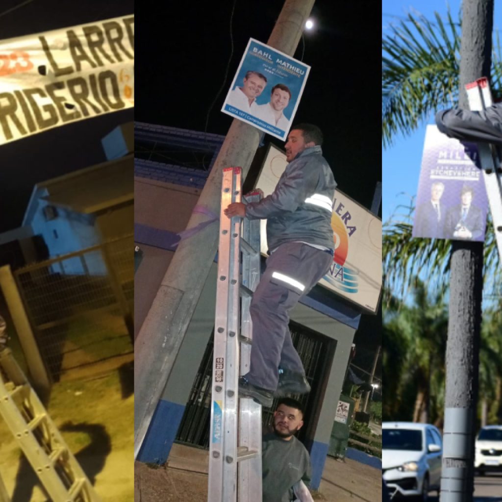 En ese contexto, se difundieron fotos de los trabajadores que quitaban carteles tanto de Frigerio, como de Bahl y Milei, entre otros.