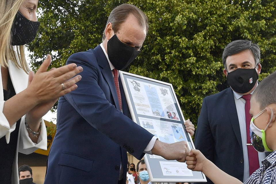 En esa plaza, el mandatario se reunió con un niño de 5 años egresado de los jardines maternales municipales que realizó un dibujo como aporte a un tríptico que todos los pequeños de los jardines realizaron en homenaje al Bicentenario de la Creación de la República.