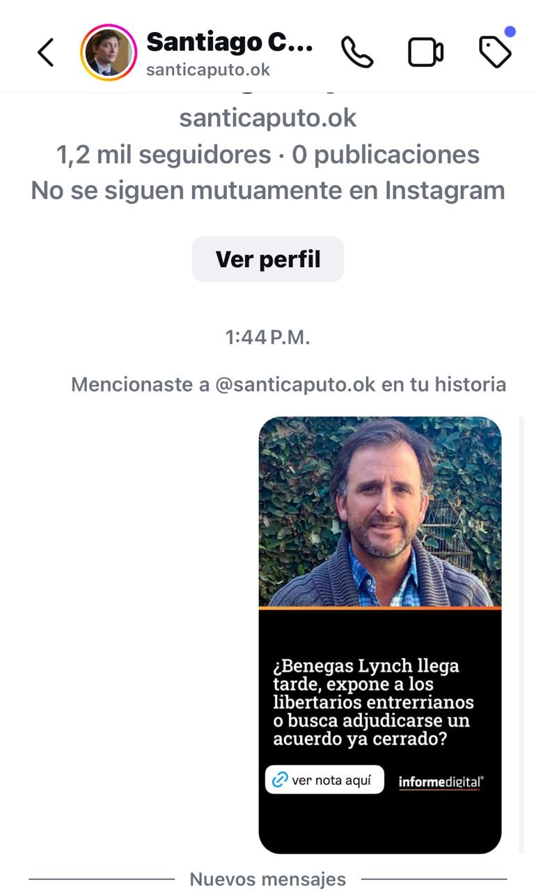 Una historia de Informe Digital reveló más que cualquier comunicado oficial. Santiago Caputo, estratega presidencial y principal asesor de Javier Milei, reposteó en Instagram una publicación de este medio sobre la visita del diputado liberal Joaquín Benegas Lynch a Entre Ríos. Minutos después, el posteo fue eliminado, pero la captura quedó.