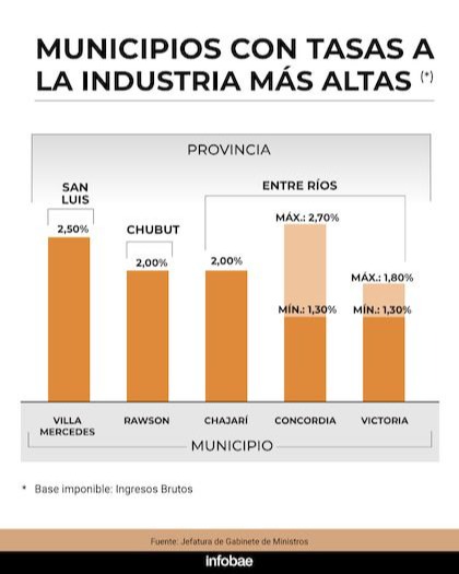 En actividades primarias, el techo nacional se ubica en 2,5% (Villa Mercedes, San Luis). Rawson (Chubut) registra 2%.