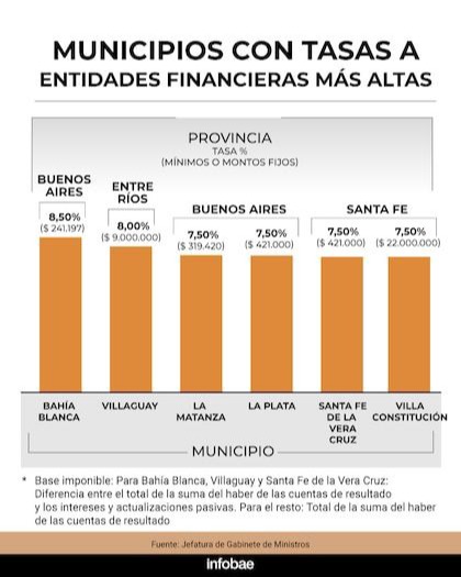 En el rubro entidades financieras, la alícuota más alta del país corresponde a Bahía Blanca (Buenos Aires) con 8,5%.