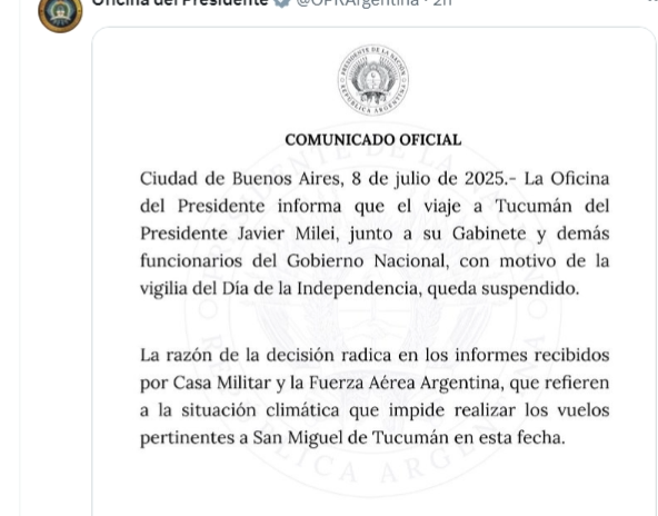 El presidente Javier Milei canceló a último momento su viaje a Tucumán, donde estaba previsto que encabezara la vigilia por el Día de la Independencia. Según se informó oficialmente, la decisión respondió a informes de Casa Militar y de la Fuerza Aérea que desaconsejaban el vuelo por condiciones meteorológicas adversas. La suspensión derivó también en la cancelación del acto institucional y de la cadena nacional prevista para la medianoche.