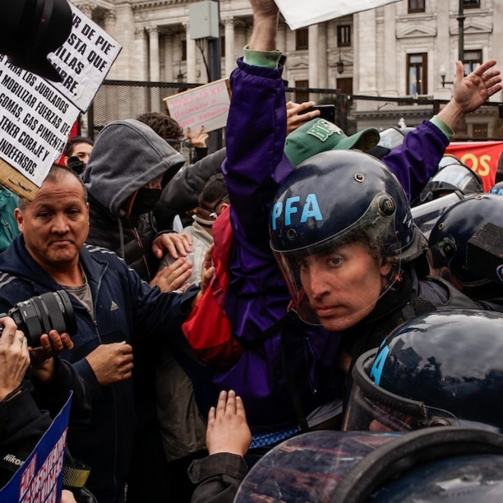 Las columnas de manifestantes se han concentrado en la plaza frente al Congreso, donde suelen desplazarse hasta la intersección de las avenidas Rivadavia y Callao. Las fuerzas de seguridad utilizaron escudos para evitar el corte de calles, lo que derivó en nuevos enfrentamientos.