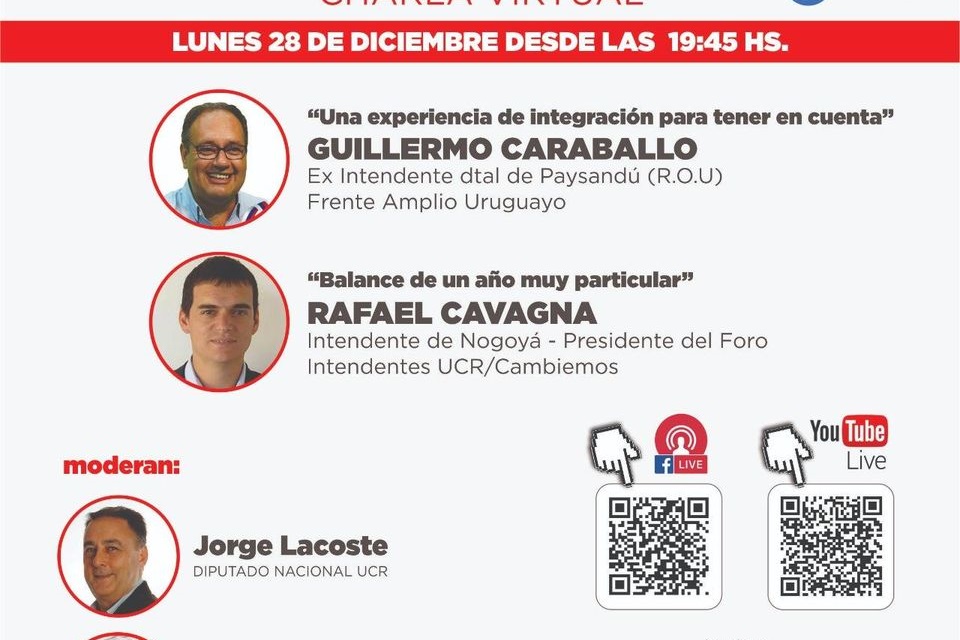El ciclo de charlas virtuales que ha venido desarrollando Convergencia a lo largo de este año 2020 concluirá este lunes con dos destacados expositores: el ex Intendente del departamento Paysandú (República Oriental del Uruguay), Guillermo Caraballo, y el presidente del Foro de Intendentes de Cambiemos e intendente de Nogoyá, Rafael Cavagna (UCR).
