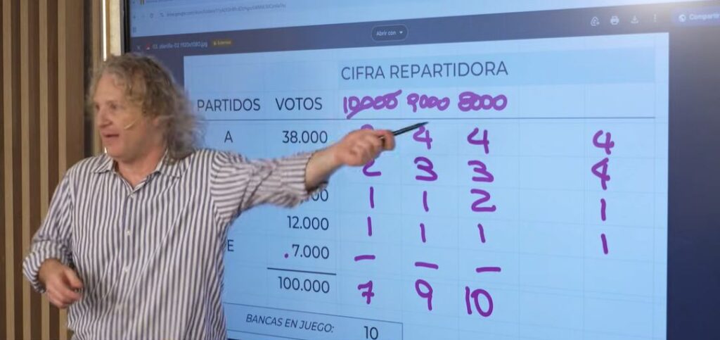 Sin embargo, la complejidad surge porque la asignación de bancas no implica una proporcionalidad lineal, y tampoco se resuelve simplemente dividiendo el total de votos por el número de bancas disponibles. Con ejemplos prácticos, pizarra y lápiz virtual, Milrud describió cómo funciona la llamada “cifra repartidora”, que es el número que se debe ajustar para que, al dividir los votos de cada partido por esa cifra, el resultado total coincida con la cantidad de bancas en juego.