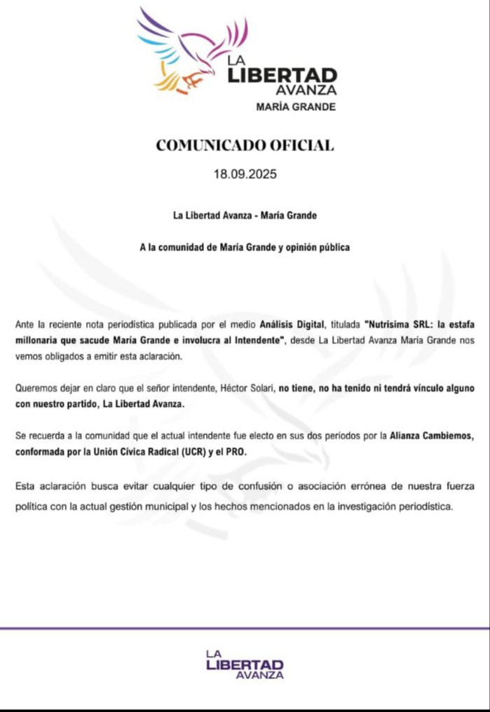 En este marco, desde la La Libertad Avanza de María Grande emitieron un comunicado en el que aclaran que el presidente municipal de dicha localidad no tiene vínculo alguno con el espacio libertario, sino que accedió al cargo como candidato de Alianza Cambiemos, conformada por la UCR y el PRO.