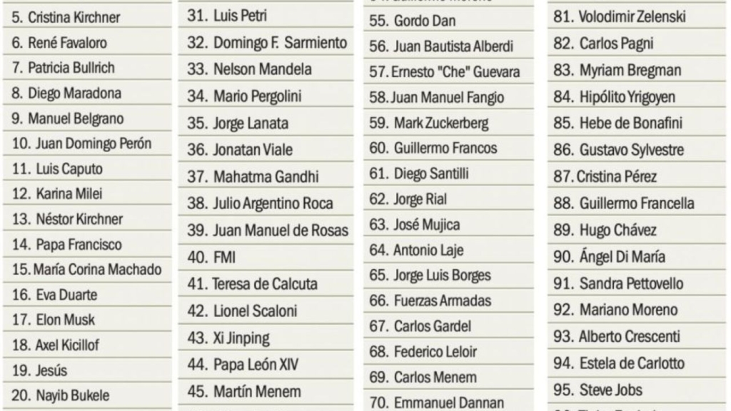 La encuesta anual de NOTICIAS, realizada por Giacobbe & Asociados entre el 5 y el 16 de diciembre, provocó un amplio revuelo en las redes al dar a conocer las 100 personalidades más influyentes de Argentina en 2025. Javier Milei encabeza el listado por tercer año consecutivo, seguido por Donald Trump y Lionel Messi. La nómina reúne a vivos, fallecidos y entidades colectivas, e incluye figuras históricas como San Martín (4°), Maradona (8°), Perón (10°) e incluso Jesús (19°). Sin embargo, lo que más llamó la atención en X fueron las posiciones de influencers, periodistas y celebridades, que generaron reacciones que oscilaron entre el orgullo, la ironía y las críticas.