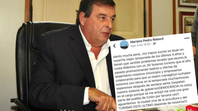 La publicación, en donde Rebord se mostraba ofuscado, cerró: “Muchachos/as esperemos después de semana santa (respeten nuestro sistema de gobierno) DEMOCRACIA, no estoy en el cargo porque se me antojó, me votó una gran parte del pueblo de Colón por tercera vez!! aguantemos la ciudad vive de la avicultura y del TURISMO ESTE ULTIMO depende de nosotros!!!” (Sic).