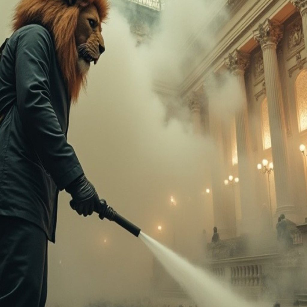 mandatario libertario, fumigando ratas dentro de lo que sería el Congreso.