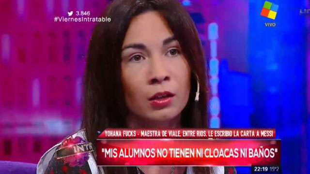 La carta que le escribió a Lionel Messi por su retiro de la selección tuvo mucho rebote. Hasta Marcelo Tinelli la leyó en la emisión del Lunes de Bailando por un sueño. Yohana Fucks, la maestra entrerriana que le pidió al crack argentino que no abandone el seleccionado, estuvo en el piso de Intratables y reveló la triste realidad de que cobra de manos del Estado $ 4000 en blanco. “Apenas llegó a los 9 mil con trabajos en negro que hago”, agregó según registró La Nación.
