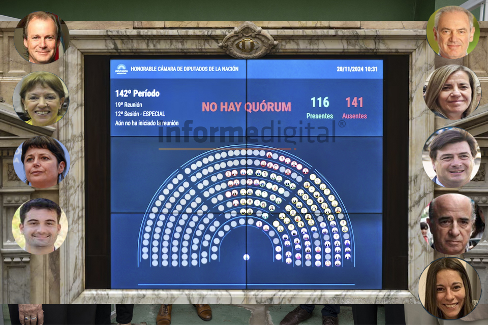 Así fue que faltaron al recinto ocho legisladores de LaLibertad Avanza (LLA), tres de PRO, dos de la UCR, siete de Encuentro Federal ydos de Democracia Para Siempre (DPS), además de, como era de esperarse, los 99que forman parte de Unión por la Patria (UP).