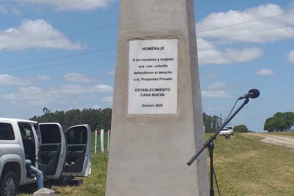 Enel monolito reza la siguiente frase: “Homenaje a los hombres y mujeres quevalientemente defendieron el derecho a la propiedad privada”.