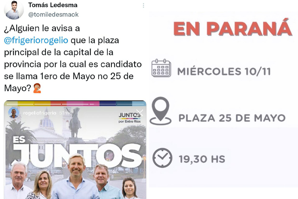 Juntos por Entre Ríos publicó un flyer con el acto de campaña que se desarrollará este miércoles en el centro paranaense. Sin embargo, los datos tienen como error el nombre de la plaza principal de la capital entrerriana y el tercero en la Lista del Frente de Todos, Tomás Ledesma, aprovechó para atribuirle el error al “porteño” Rogelio Frigerio.