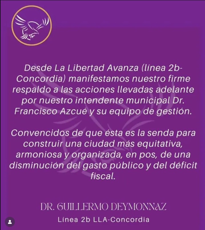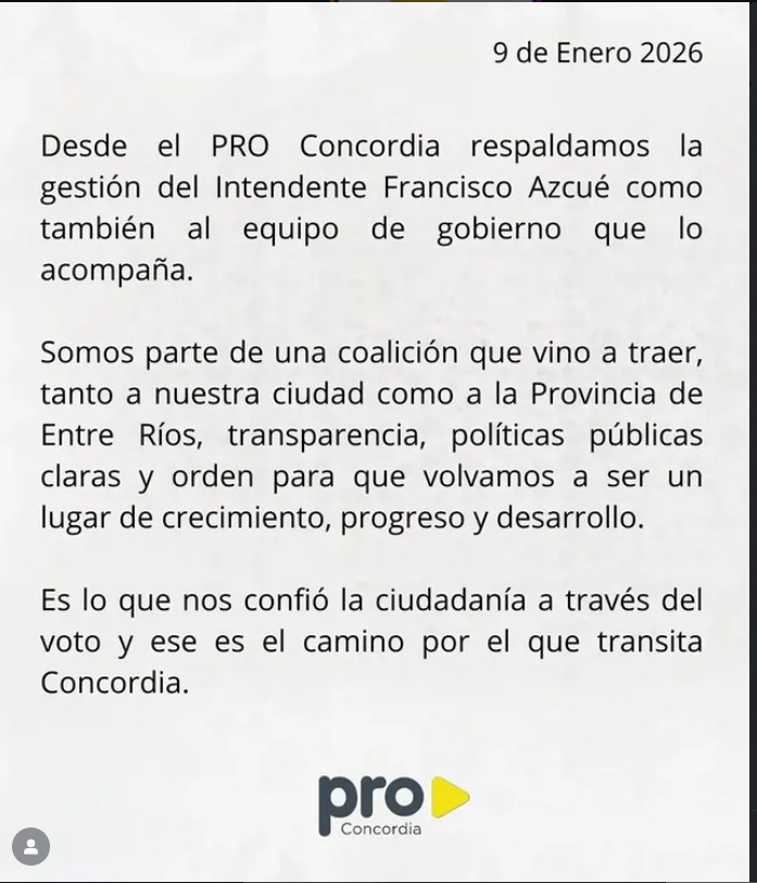En paralelo, el conflicto sumó un capítulo político. La Libertad Avanza y el PRO de esa localidad manifestaron públicamente su respaldo al titular del Ejecutivo municpal concordiense.