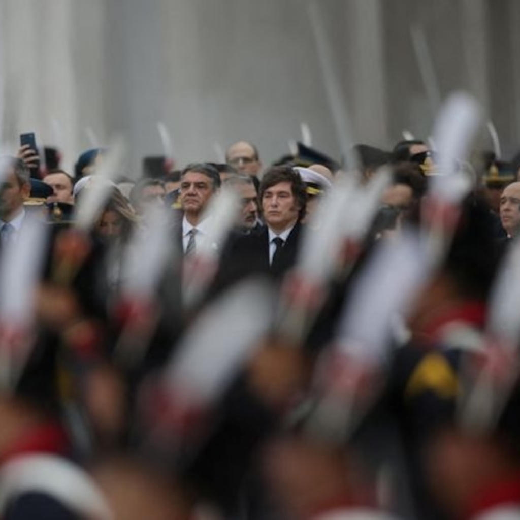 El evento fue publicado en la cuenta de X de la Oficina del Presidente, con una foto en la que Milei aparece junto a su hermana, Karina, el ministro de Defensa, Luis Petri, y otros miembros del cuerpo. Todos están de pie alrededor de un escudo impreso en el suelo del salón que resalta las palabras “deber”, “libertad”, “valor”, “honor”.