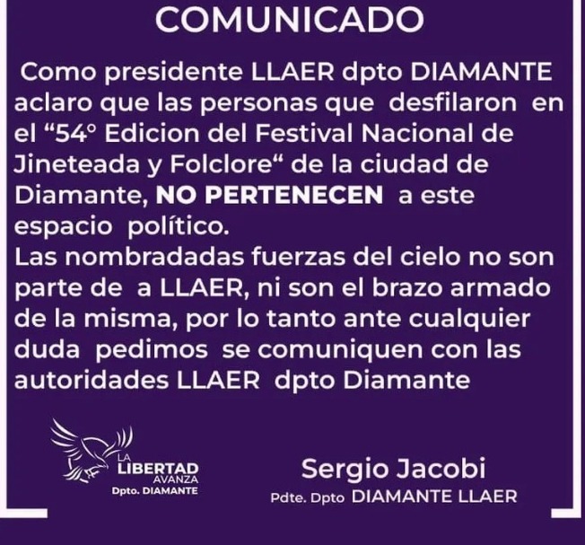 Luego de que un grupo de militantes participara del desfile con estandartes y banderas de Las Fuerzas del Cielo, el presidente de la departamental Diamante de La Libertad Avanza, Sergio Jacobi, publicó un comunicado en el que aclaró: “Las personas nombradas Fuerzas del Cielo no son parte de LLAER. Ante cualquier duda, pedimos que se comuniquen con las autoridades del departamento Diamante”.