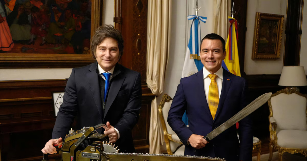 Sin embargo, una reciente decisión del gobierno ecuatoriano que encabeza el presidente Daniel Noboa, afín a Milei, como evidencia la foto de arriba, fue interpretada como un anticipo de lo que podría hacer el gobierno argentino para afrontar los vencimientos de deuda en dólares del próximo 9 de junio, unos USD 4.500 millones “brutos”.