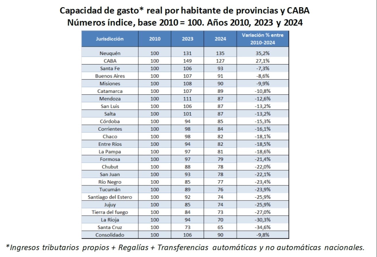 Mientras CABA y Neuquén lideraron el crecimiento en capacidad de gasto, con subas del 27,1% y 35,2% respectivamente, el resto del país mostró deterioros generalizados. En ese mapa, Entre Ríos aparece claramente entre las jurisdicciones más afectadas, sólo por detrás de provincias con colapsos aún más severos como Santa Cruz o La Rioja.