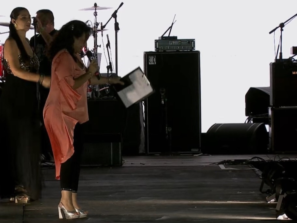 La protagonista de la historia es la periodista Sonia Fernández, quien tenía a su cargo la conducción del evento. La escena ocurrió este sábado a la noche, en un momento en que la locutora interactuaba con el público y se dispuso a leer los carteles que muchos de los presentes habían llevado.