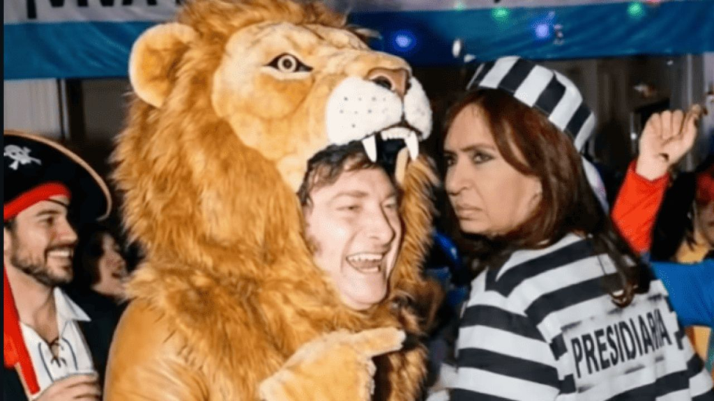 Cristina Kirchner aparece caracterizada como presa, con un traje a rayas blanco y negro, en referencia directa a sus causas judiciales. Javier Milei, en tanto, es representado como un león, el símbolo que el propio Presidente adoptó como emblema político y personal desde su irrupción en la escena pública.