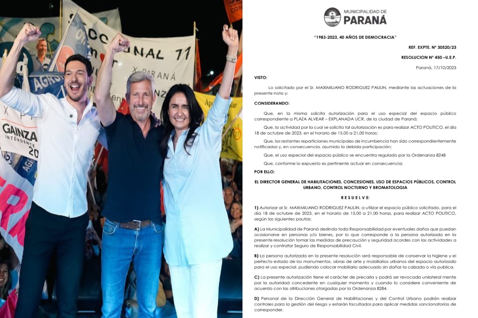 A raíz de ese anuncio oficial, el candidato a intendente dela capital entrerriana de la oposición, Emanuel Gainza, publicó en las redessociales el petitorio del edil Maximiliano Rodríguez Paulin, solicitando conanticipación el espacio, requisitoria que fue aprobada por el Dr. GuillermoComas Cancio, Director general de habilitaciones, concesiones y uso de espaciospúblicos de la ciudad de Paraná.