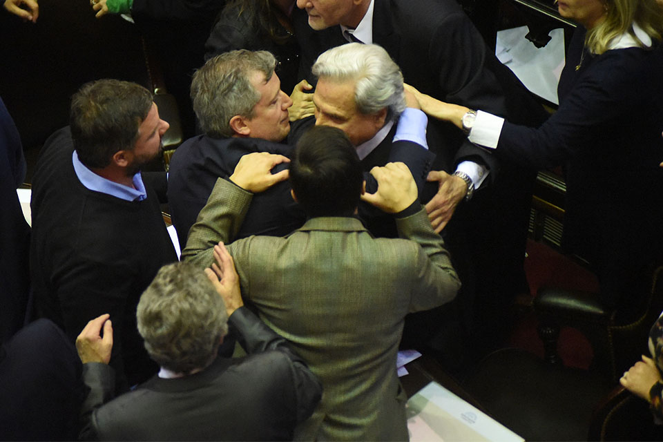 La sesión de la Cámara de Diputados de la Nación de este miércoles para el debate y tratamiento del proyecto de ley de presupuesto nacional 2019 tuvo momentos escandalosos, en los que hubo cruces muy elevados de temperatura entre legisladores y obligaron a definir dos cuartos intermedios. En una de las escenas, casi pugilísticas, se pudo ver al entrerriano Julio Solanas, del Frente para la Victoria, en medio de la maroma que envolvió a diputados oficialistas y opositores.